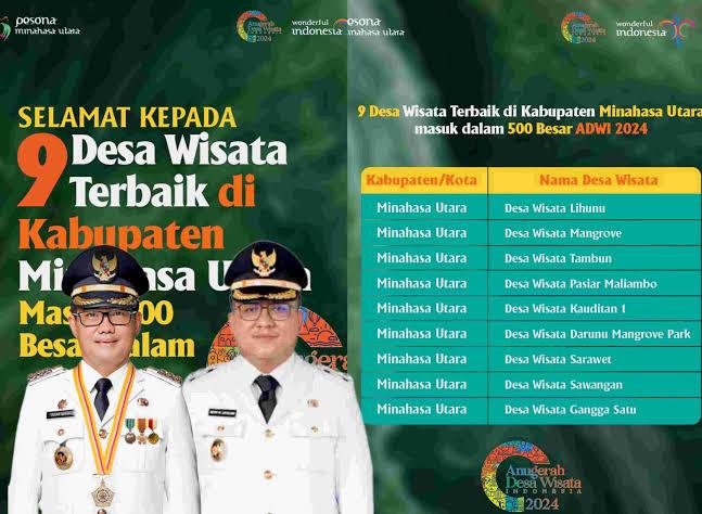 • 500 besar ADWI Desa Tinongko, Desa Darunu, Desa Maliambao, Desa Tambun, Desa Lihunu, Desa Sawangan, Desa Gangga I, Desa Sarawet, Desa Kauditan I diberikan oleh Kemenparekraf tahun 2024.