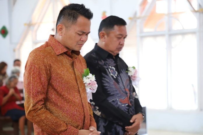 MITRA- Bupati Mitra Ronald Kandoli (RK) bersama Ketua TP-PKK Ny.Stefa Kandoli Antou, Wakil Bupati Fredy Tuda (FT) dan Sekretaris TP- PKK Ny.Sandra Tuda Kindangen,S.Th,M.Pd beserta keluarga beribadah bersama Jemaat GMIM Iwekahalesan Betelen Wilayah Tombatu, Minggu (16/3/2025).