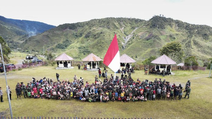 Papua – Satgas Pamtas Kewilayahan Yonif 715/Motuliato mengajak jajaran Aparat Keamanan (Apkam) yang ada di Puncak Jaya, bersama dengan seluruh elemen masyarakat Papua Tengah, mengibarkan bendera Merah Putih raksasa di bukit zaitun, pada Kamis (01/05/2025).