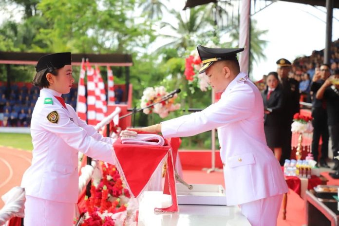 Pasukan Pengibar Bendera Pusaka (Paskibraka) Kabupaten Minahasa Tenggara sukses menjalankan tugas pengibaran bendera merah putih dengan penuh disiplin dan semangat, menambah kekhidmatan suasana peringatan HUT ke-80 RI.