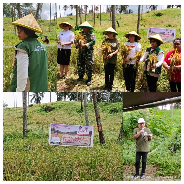 Minut, Jelajahterkini.com – Pemerintah Kabupaten Minahasa Utara, yang diwakili oleh Kepala Dinas Pertanian (Kadis Pertanian) Bertha Katuuk, mengikuti kegiatan panen padi ladang dalam rangka mendukung swasembada pangan di Desa Kuwil, Kecamatan Kalawat, lokasi Kebun Pangi, pada Jumat (6/4/2026).