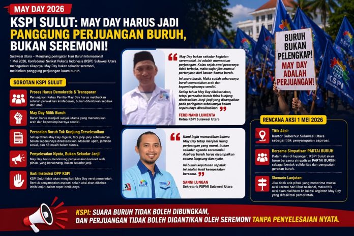 Minut (Sulawesi Utara), Jelajahterkini.com – Menjelang peringatan Hari Buruh Internasional (May Day) 1 Mei 2026, Konfederasi Serikat Pekerja Indonesia (KSPI) Sulawesi Utara menegaskan sikapnya: May Day bukan sekadar seremoni, melainkan panggung perjuangan kaum buruh. Dalam pernyataan sikap resminya, KSPI Sulawesi Utara menyoroti pentingnya proses yang demokratis dan transparan dalam setiap pengambilan keputusan.